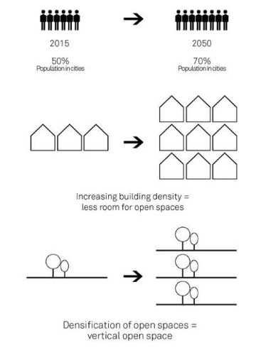 An ever-growing structural density leaves less room for new open spaces in the city, as the urban population’s desire for more qualified open spaces is growing. This leads to the necessity to depart away from the traditional way of conceptualising and developing open spaces. To this regard, Zintl and Treml (2016) formulated the idea of the vertical open space, a symbiosis of built and open space, and therefore the combination of architecture and the objectives of landscape architecture.