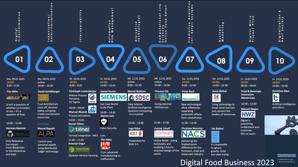 The Digital Food Business Week from the 9th to the 13th of January 2023 gathers a series of speakers around the topic of Digitalization and Food at the ZHAW Wädenswil as part of the consecutive MSc Life Science Specialization Food & Beverage Innovation.