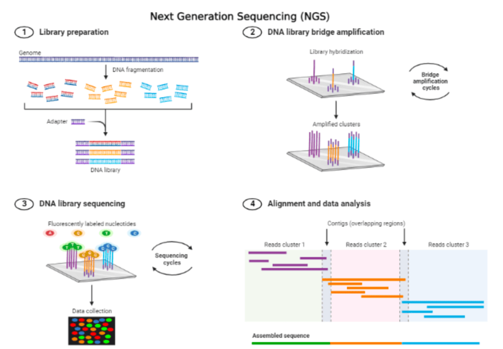 The journey began with the Human Genome Project (HGP) in the 1990s, a massive international effort to sequence the entire human genome. This major project stimulated the advancement of sequencing technologies, making them faster, cheaper and more accessible. Techniques such as Sanger sequencing gave way to next-generation sequencing (NGS), which allowed whole genomes to be analysed in a matter of hours instead of years, in figure 1 is possible to see the process of the NGS, which is way more efficient.