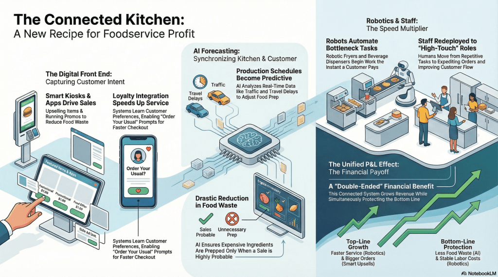 - Bottom-Line Protection: AI forecasting minimizes food waste (lower COGS) and Robotics stabilize labor costs (lower OpEx), protecting margins even as wages rise.